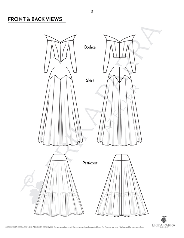 The pattern features a bodice with princess seams, a stand off shoulder collar and long sleeves, fully lined and center back closing. An A-line skirt with a yoke. Front, side and back double box pleats and closing at center back. Additionally, it includes a three layer petticoat.